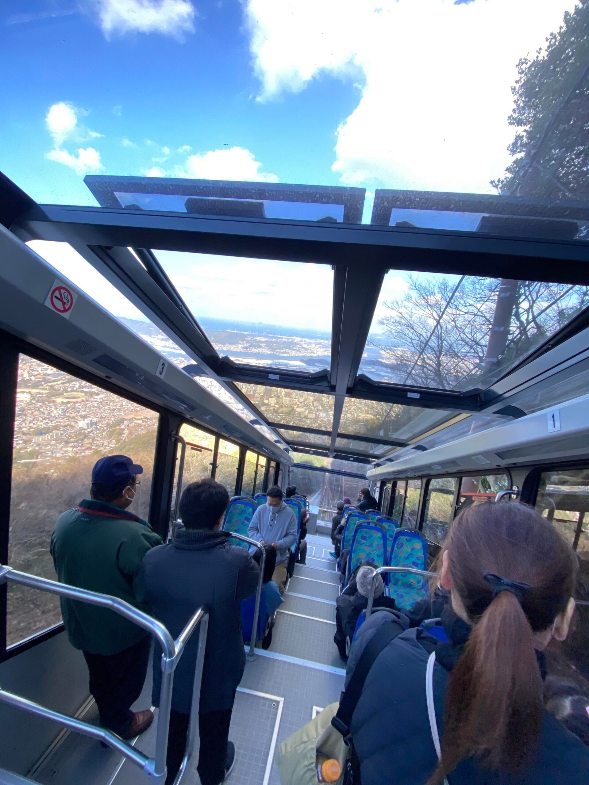 中腹の帆柱稲荷神社から始まり、ケーブルカー、スロープカーを使って山頂へ。